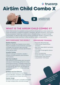 The AirSim Child Combo X features the uniquely constructed AirSim airway enhanced with tracheal rings, simulated cricoid and laryngeal cartilages. This combination creates an ideal solution for realistic training in airway management, percutaneous tracheostomy and emergency cricothyroidotomy. TruCorp’s AirSim Child Combo X is the most advanced and realistic pediatric airway trainer on the market today, designed to withstand repeated use in a classroom setting.